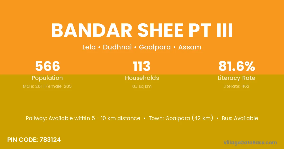 Goalpara (42 km) is the nearest town to Bandar Shee Pt Iii village for major economic activities and is located approximately 42 km away.