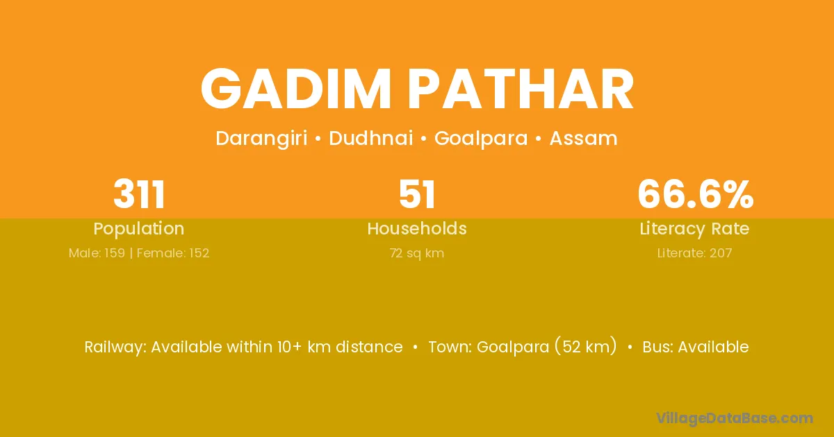 Goalpara (52 km) is the nearest town to Gadim Pathar village for major economic activities and is located approximately 52 km away.