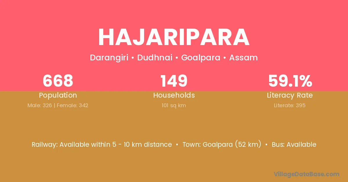 Goalpara (52 km) is the nearest town to Hajaripara village for major economic activities and is located approximately 52 km away.