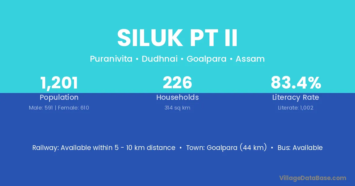 Goalpara (44 km) is the nearest town to Siluk Pt Ii village for major economic activities and is located approximately 44 km away.