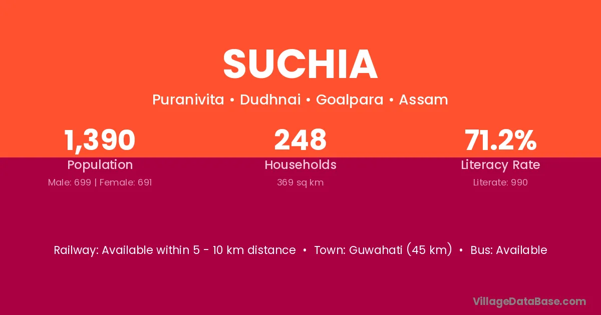 Guwahati (45 km) is the nearest town to Suchia village for major economic activities and is located approximately 45 km away.