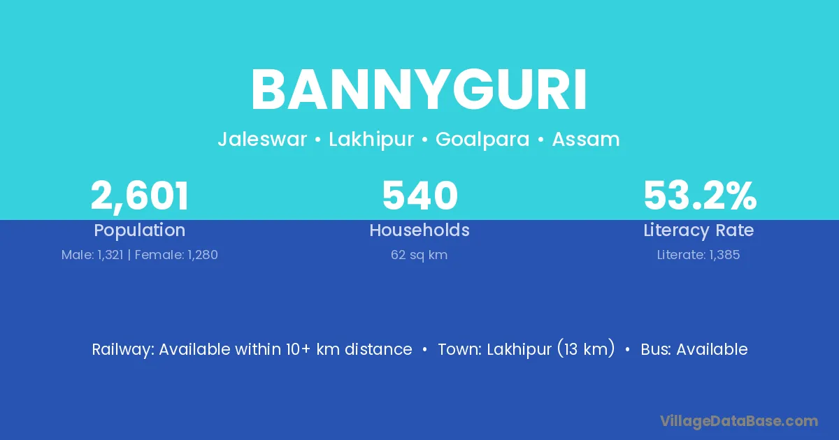 Lakhipur (13 km) is the nearest town to Bannyguri village for major economic activities and is located approximately 13 km away.
