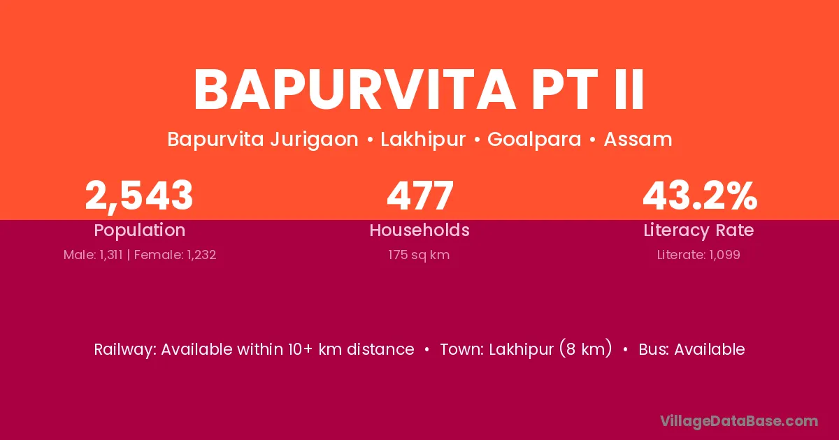 Lakhipur (8 km) is the nearest town to Bapurvita Pt Ii village for major economic activities and is located approximately 8 km away.