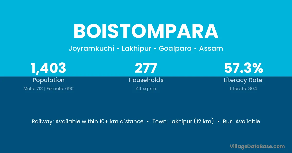 Lakhipur (12 km) is the nearest town to Boistompara village for major economic activities and is located approximately 12 km away.