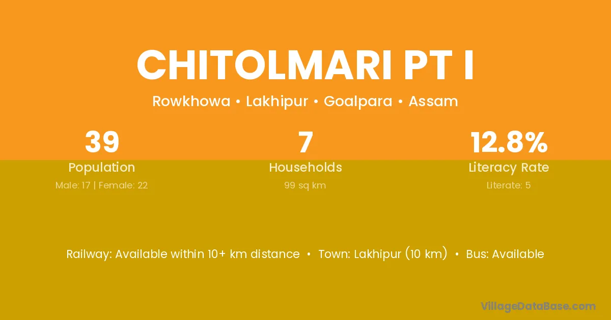 Chitolmari Pt I village has a total population of 39 people, of which 17 are males and 22 are females.