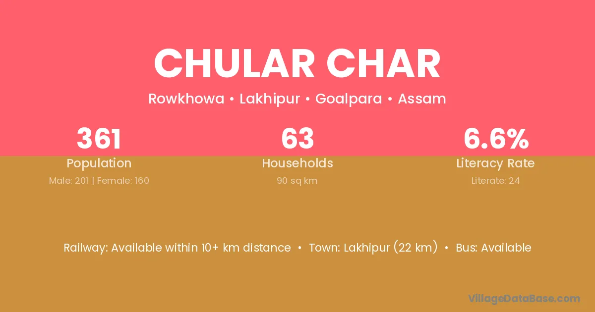 Lakhipur (22 km) is the nearest town to Chular Char village for major economic activities and is located approximately 22 km away.