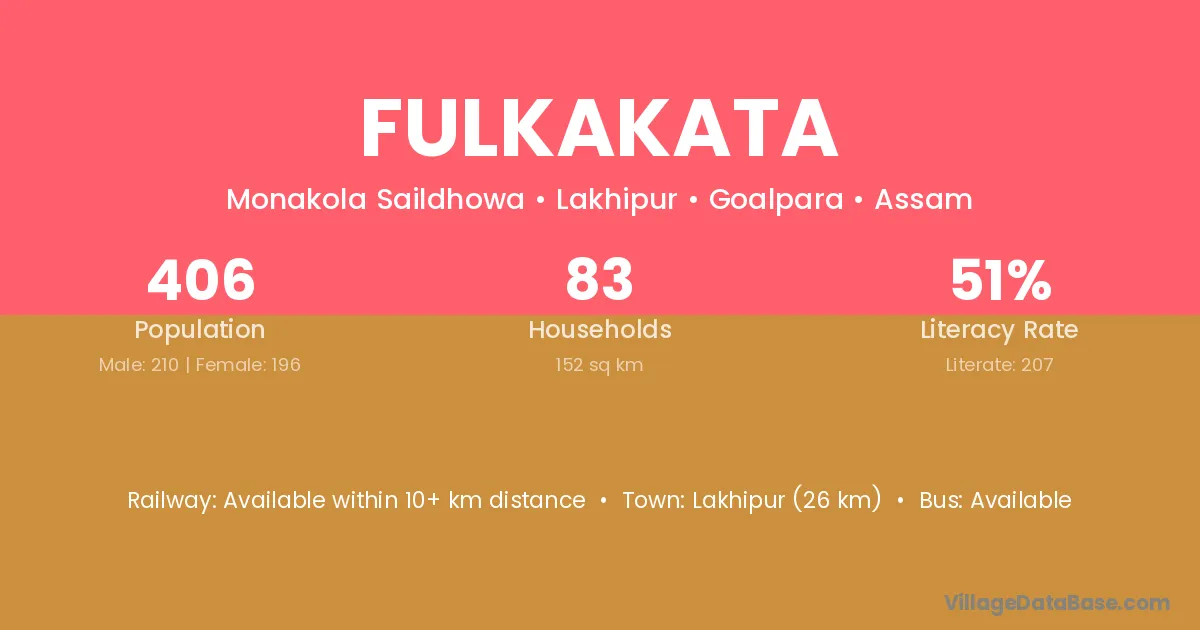 Lakhipur (26 km) is the nearest town to Fulkakata village for major economic activities and is located approximately 26 km away.