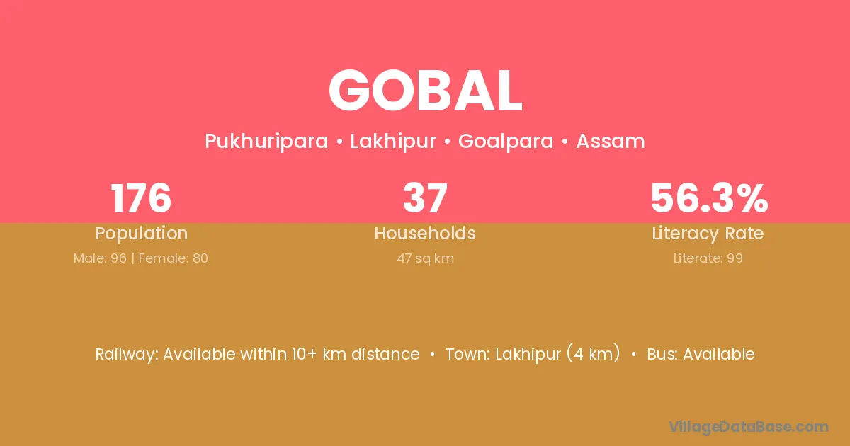 Lakhipur (4 km) is the nearest town to Gobal village for major economic activities and is located approximately 4 km away.