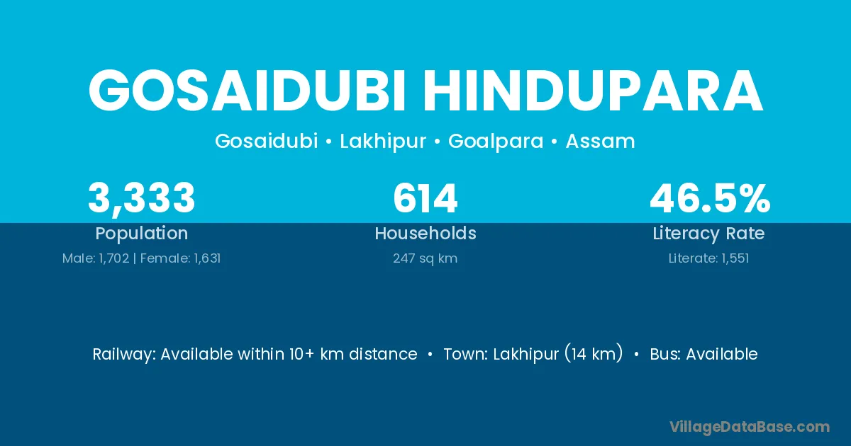 Lakhipur (14 km) is the nearest town to Gosaidubi Hindupara village for major economic activities and is located approximately 14 km away.