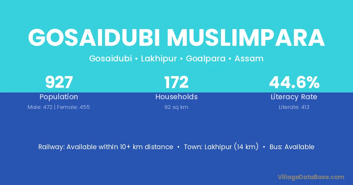 Lakhipur (14 km) is the nearest town to Gosaidubi Muslimpara village for major economic activities and is located approximately 14 km away.