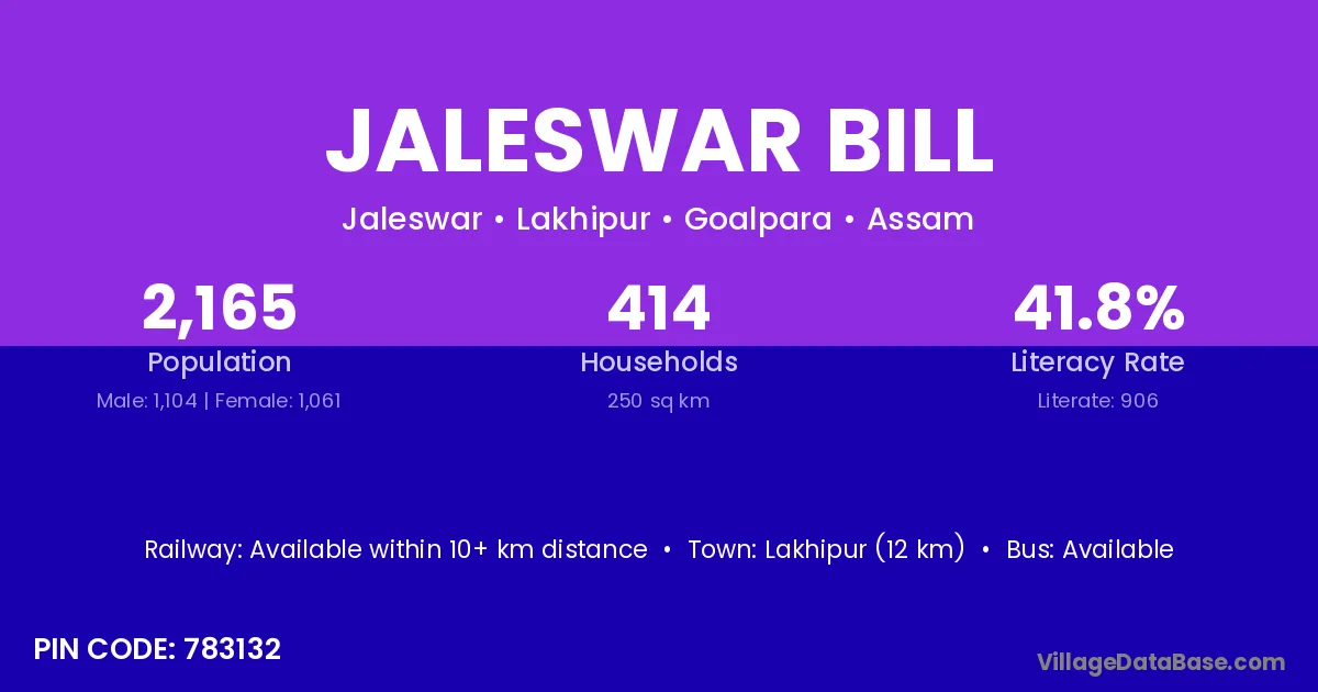 Lakhipur (12 km) is the nearest town to Jaleswar Bill village for major economic activities and is located approximately 12 km away.