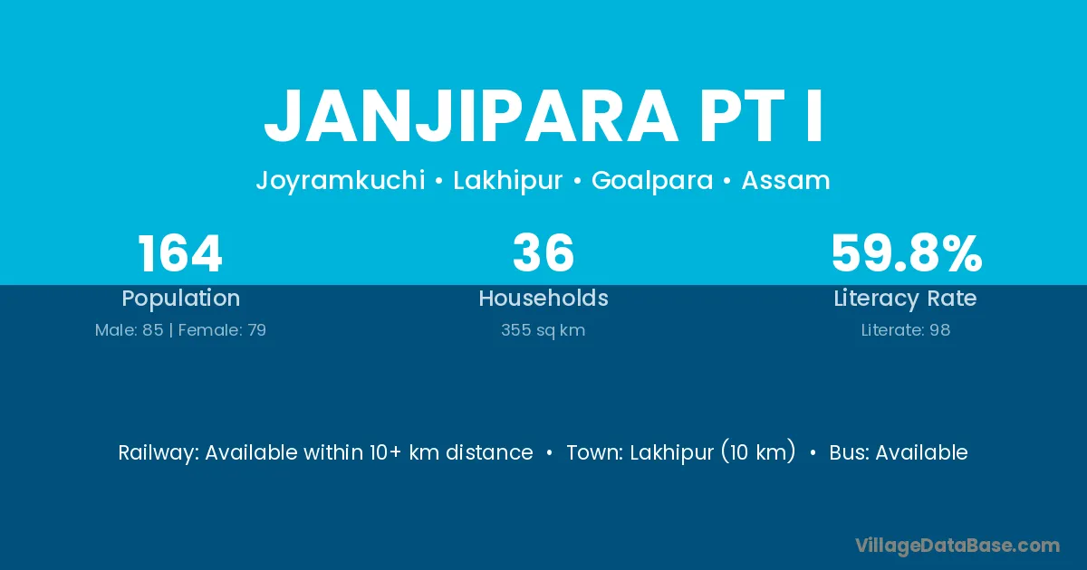 Lakhipur (10 km) is the nearest town to Janjipara Pt I village for major economic activities and is located approximately 10 km away.