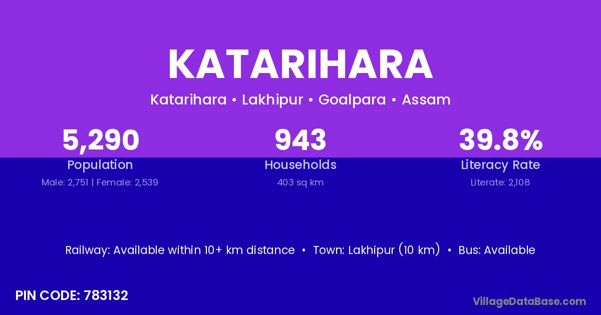 Lakhipur (10 km) is the nearest town to Katarihara village for major economic activities and is located approximately 10 km away.