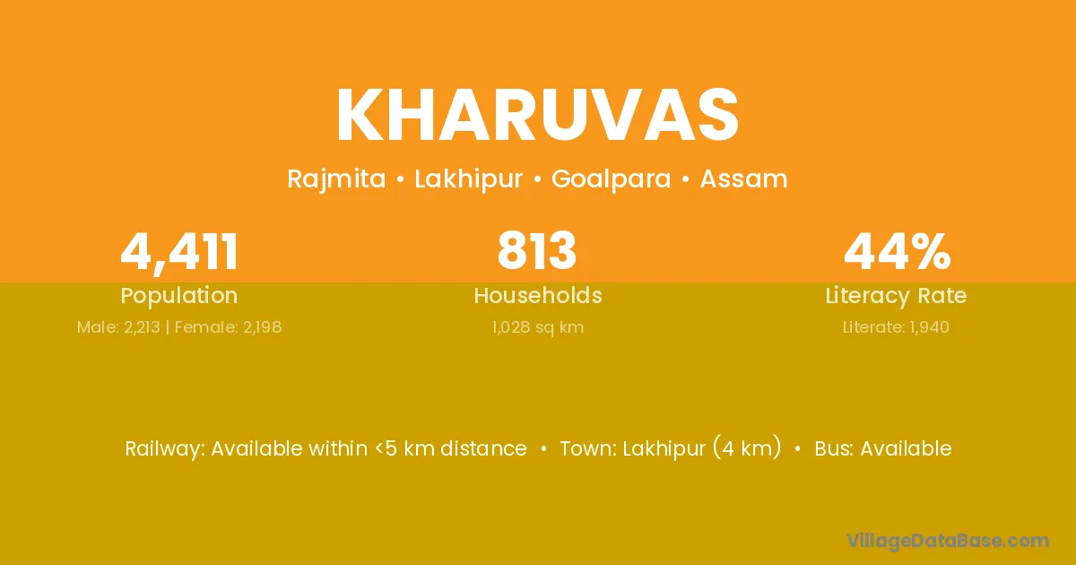 Lakhipur (4 km) is the nearest town to Kharuvas village for major economic activities and is located approximately 4 km away.