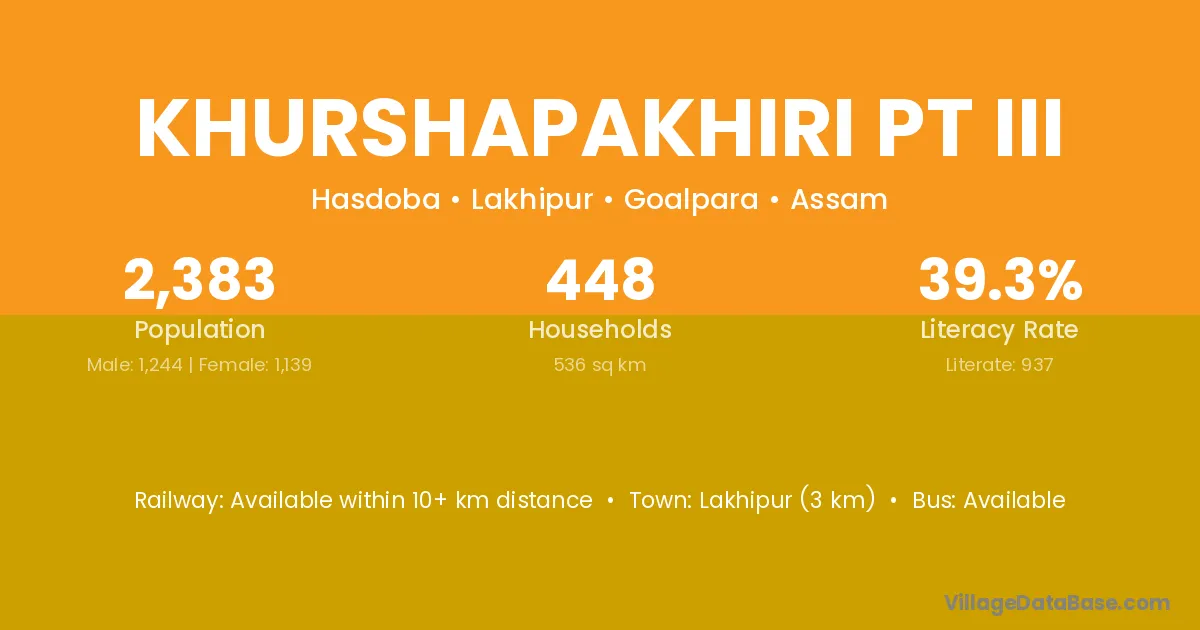 Lakhipur (3 km) is the nearest town to Khurshapakhiri Pt Iii village for major economic activities and is located approximately 3 km away.