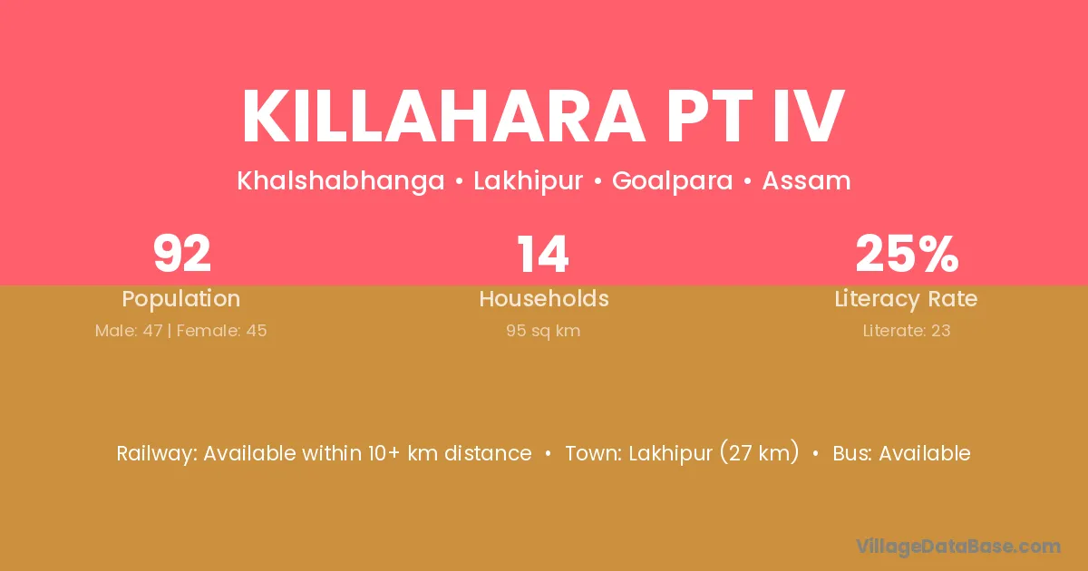 Lakhipur (27 km) is the nearest town to Killahara Pt Iv village for major economic activities and is located approximately 27 km away.