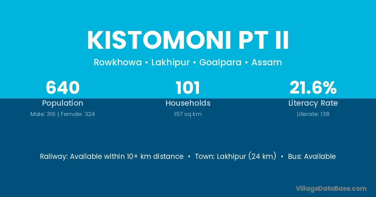 Lakhipur (24 km) is the nearest town to Kistomoni Pt Ii village for major economic activities and is located approximately 24 km away.