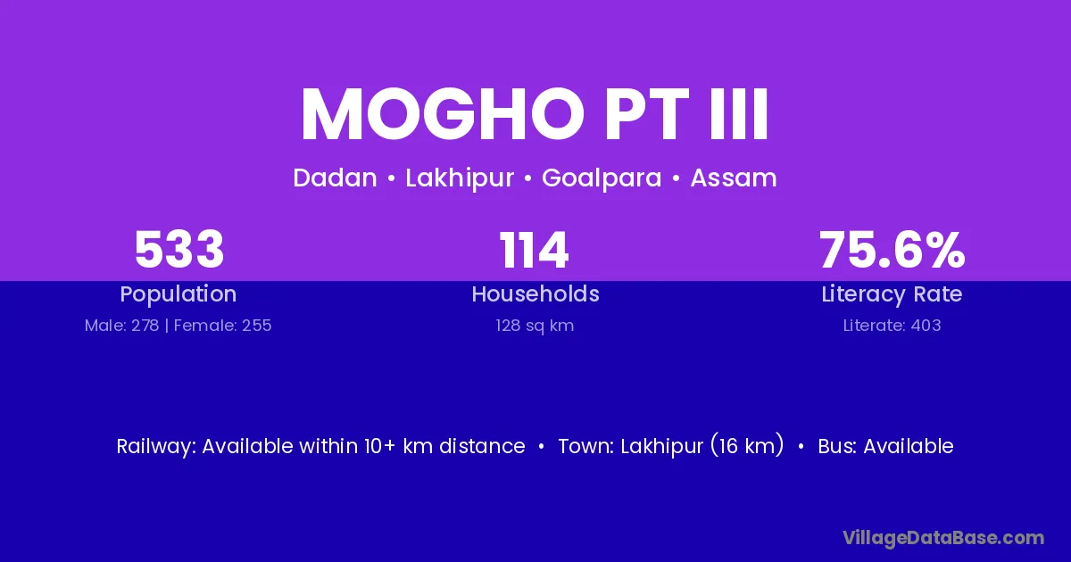 Lakhipur (16 km) is the nearest town to Mogho Pt Iii village for major economic activities and is located approximately 16 km away.