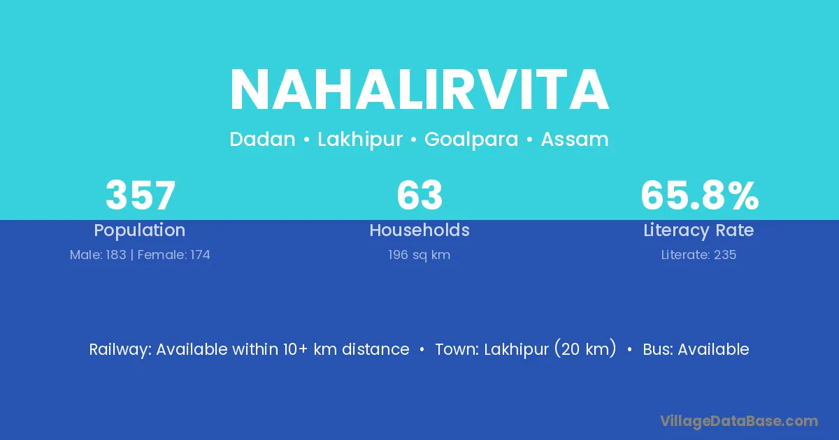 Lakhipur (20 km) is the nearest town to Nahalirvita village for major economic activities and is located approximately 20 km away.
