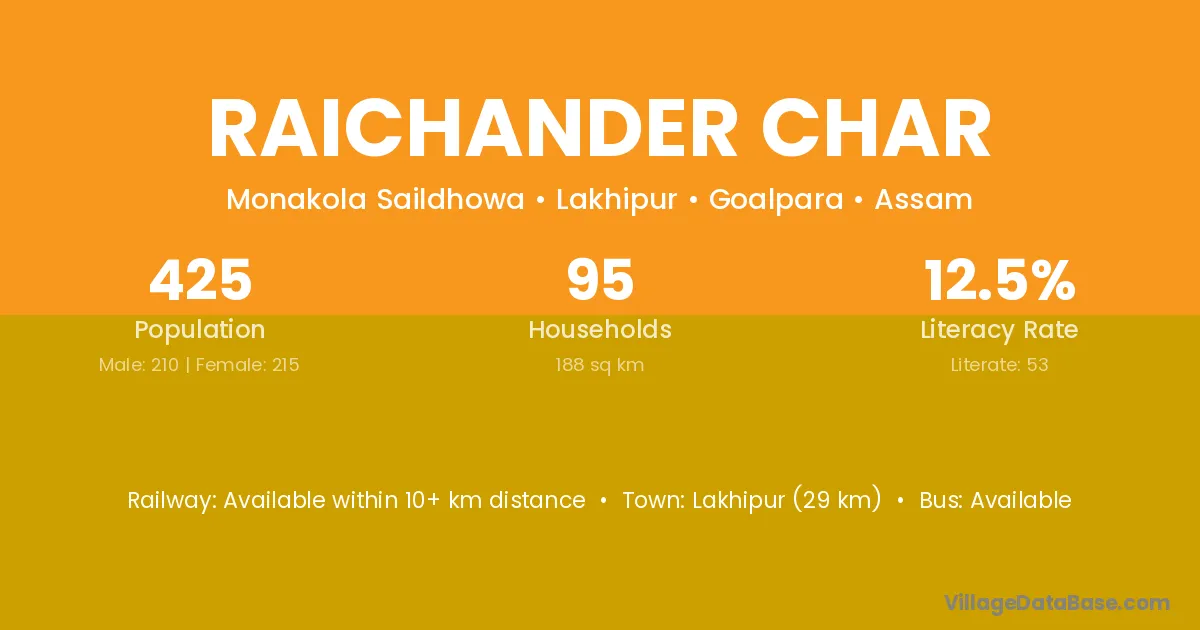 Lakhipur (29 km) is the nearest town to Raichander Char village for major economic activities and is located approximately 29 km away.