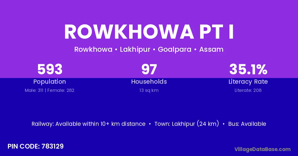 Lakhipur (24 km) is the nearest town to Rowkhowa Pt I village for major economic activities and is located approximately 24 km away.