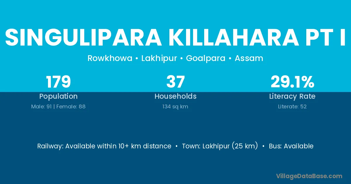 Lakhipur (25 km) is the nearest town to Singulipara Killahara Pt I village for major economic activities and is located approximately 25 km away.