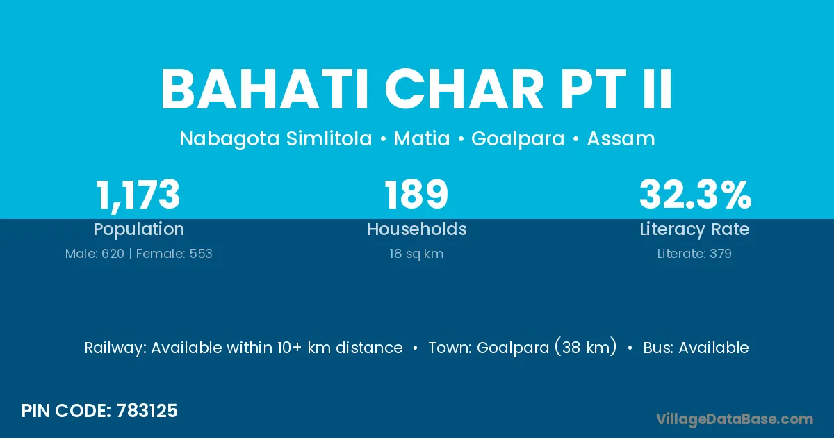 Goalpara (38 km) is the nearest town to Bahati Char Pt Ii village for major economic activities and is located approximately 38 km away.
