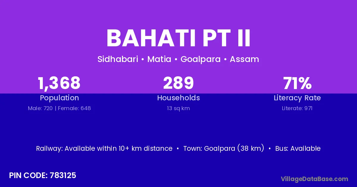 Goalpara (38 km) is the nearest town to Bahati Pt Ii village for major economic activities and is located approximately 38 km away.