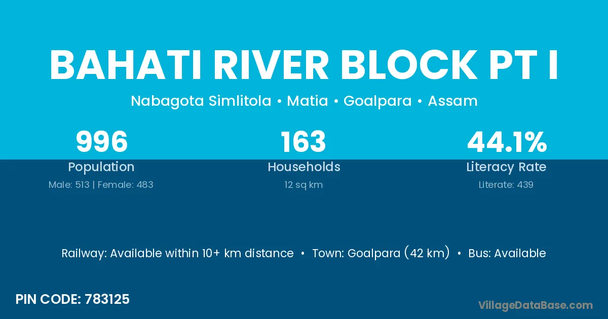 Goalpara (42 km) is the nearest town to Bahati River Block Pt I village for major economic activities and is located approximately 42 km away.