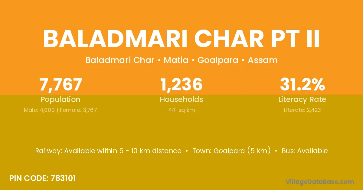 Goalpara (5 km) is the nearest town to Baladmari Char Pt Ii village for major economic activities and is located approximately 5 km away.