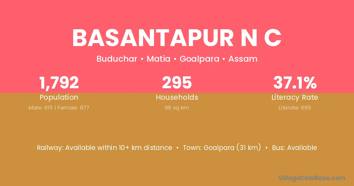 Goalpara (31 km) is the nearest town to Basantapur N C village for major economic activities and is located approximately 31 km away.