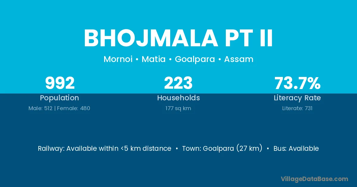Goalpara (27 km) is the nearest town to Bhojmala Pt Ii village for major economic activities and is located approximately 27 km away.
