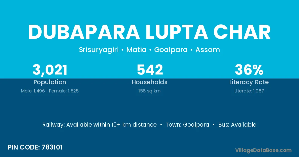 Dubapara Lupta Char village has a total population of 3,021 people, of which 1,496 are males and 1,525 are females.