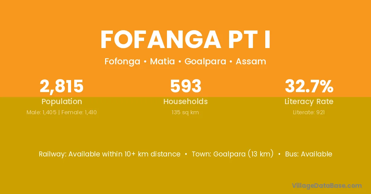 Goalpara (13 km) is the nearest town to Fofanga Pt I village for major economic activities and is located approximately 13 km away.
