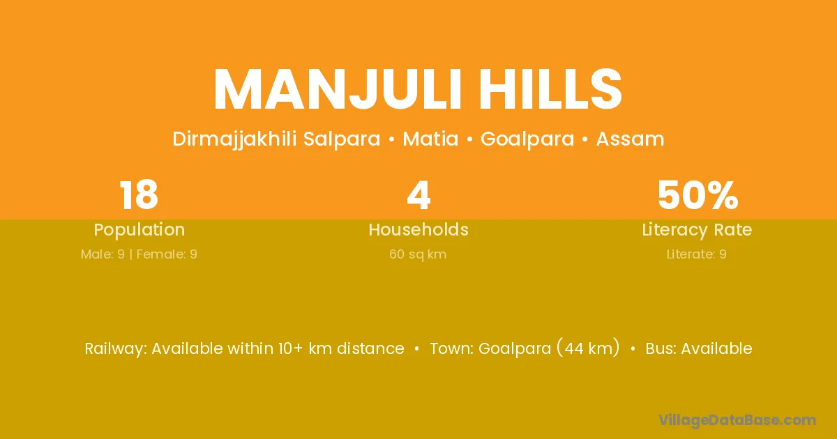 Manjuli Hills village has a total population of 18 people, of which 9 are males and 9 are females.