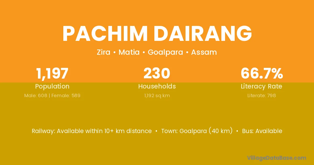 Goalpara (40 km) is the nearest town to Pachim Dairang village for major economic activities and is located approximately 40 km away.