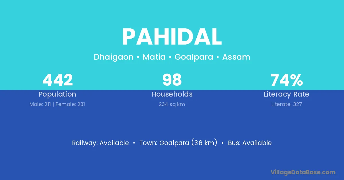 Goalpara (36 km) is the nearest town to Pahidal village for major economic activities and is located approximately 36 km away.