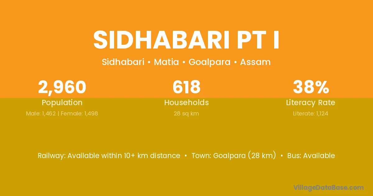Goalpara (28 km) is the nearest town to Sidhabari Pt I village for major economic activities and is located approximately 28 km away.