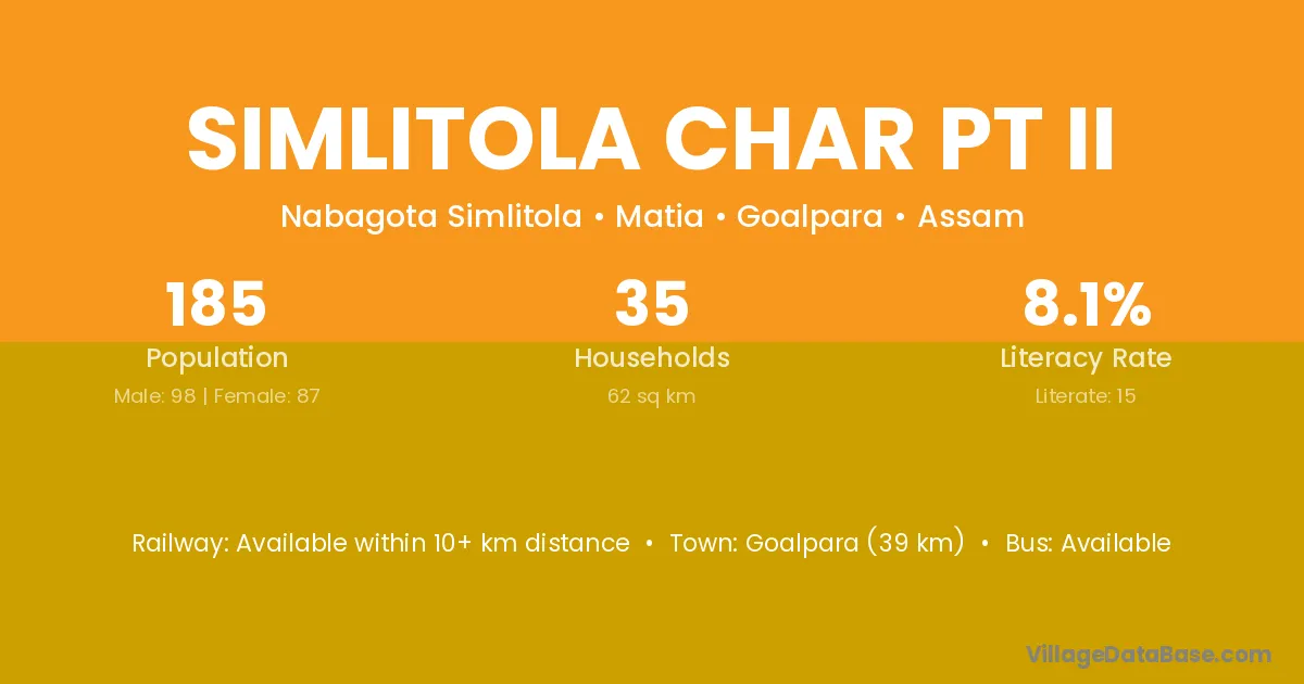 Goalpara (39 km) is the nearest town to Simlitola Char Pt Ii village for major economic activities and is located approximately 39 km away.