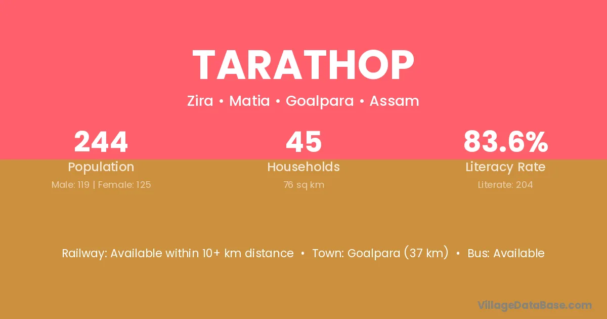Goalpara (37 km) is the nearest town to Tarathop village for major economic activities and is located approximately 37 km away.