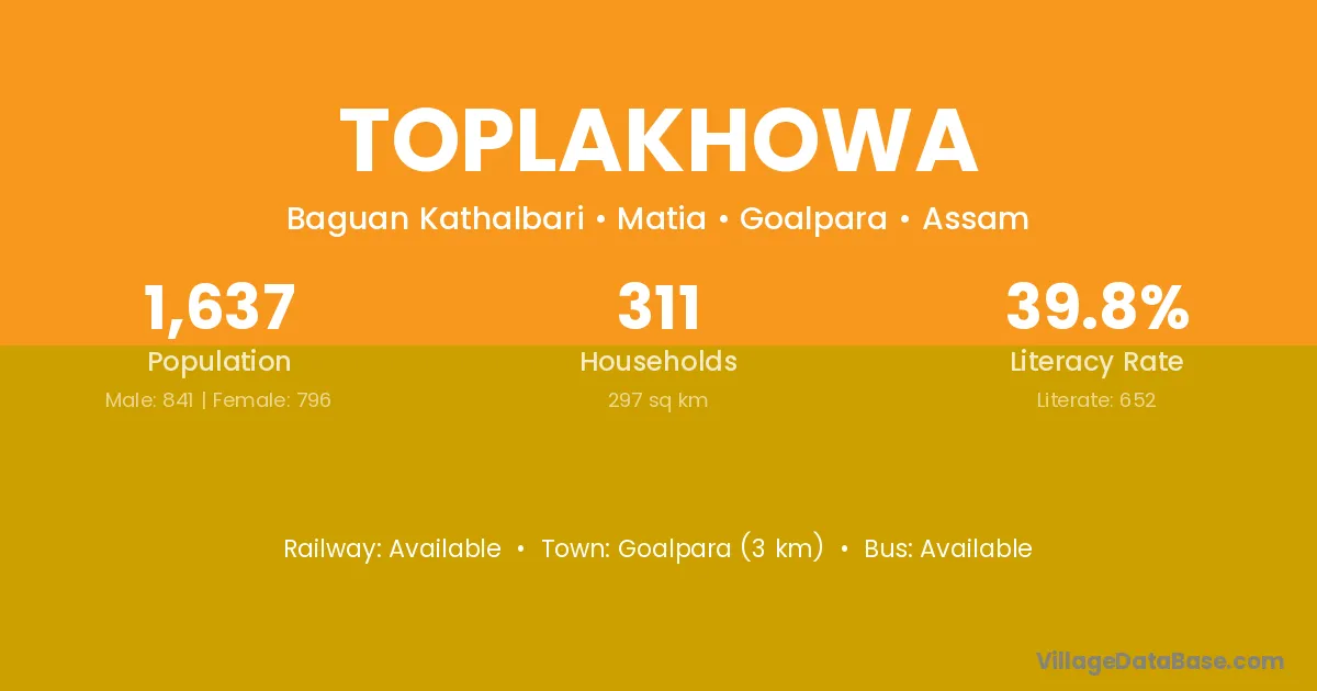 Goalpara (3 km) is the nearest town to Toplakhowa village for major economic activities and is located approximately 3 km away.
