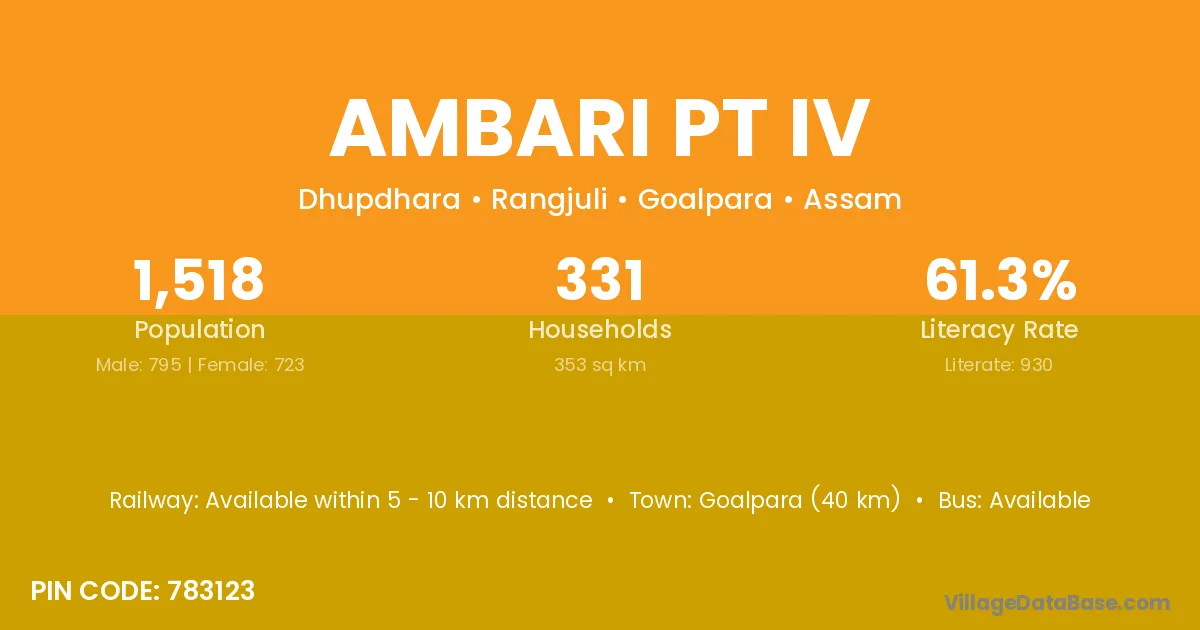 Goalpara (40 km) is the nearest town to Ambari Pt Iv village for major economic activities and is located approximately 40 km away.