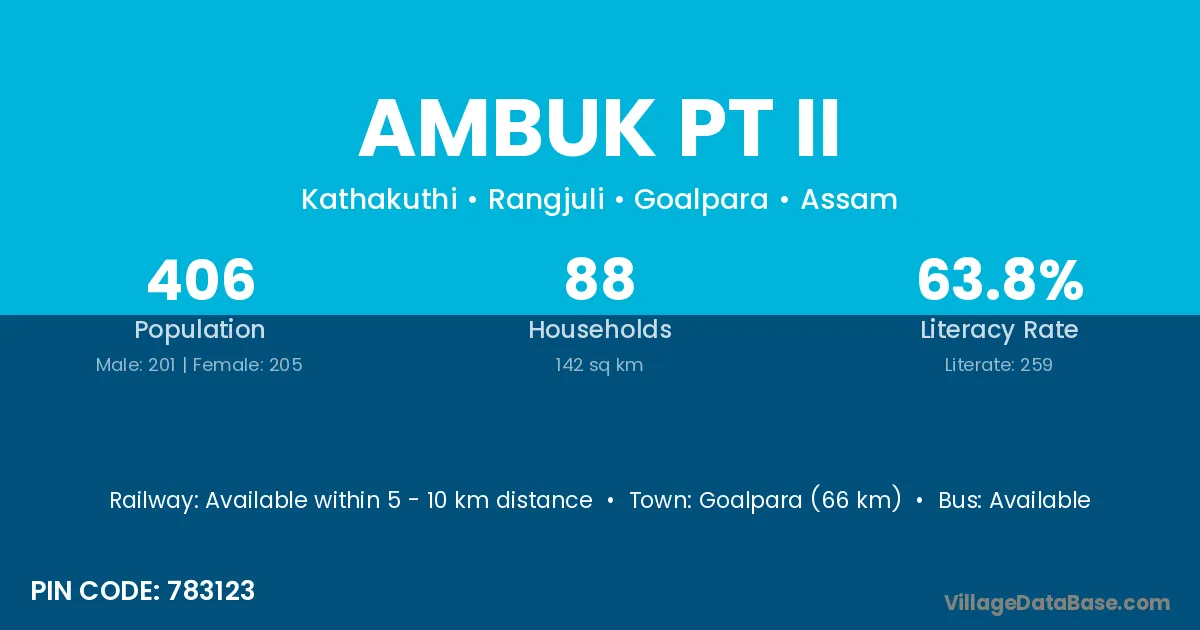 Goalpara (66 km) is the nearest town to Ambuk Pt Ii village for major economic activities and is located approximately 66 km away.