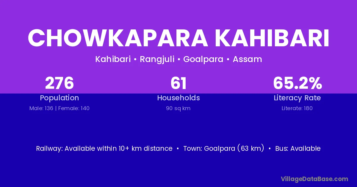 Goalpara (63 km) is the nearest town to Chowkapara Kahibari village for major economic activities and is located approximately 63 km away.