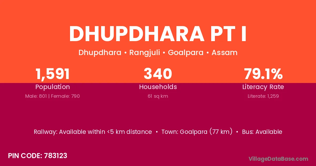 Goalpara (77 km) is the nearest town to Dhupdhara Pt I village for major economic activities and is located approximately 77 km away.