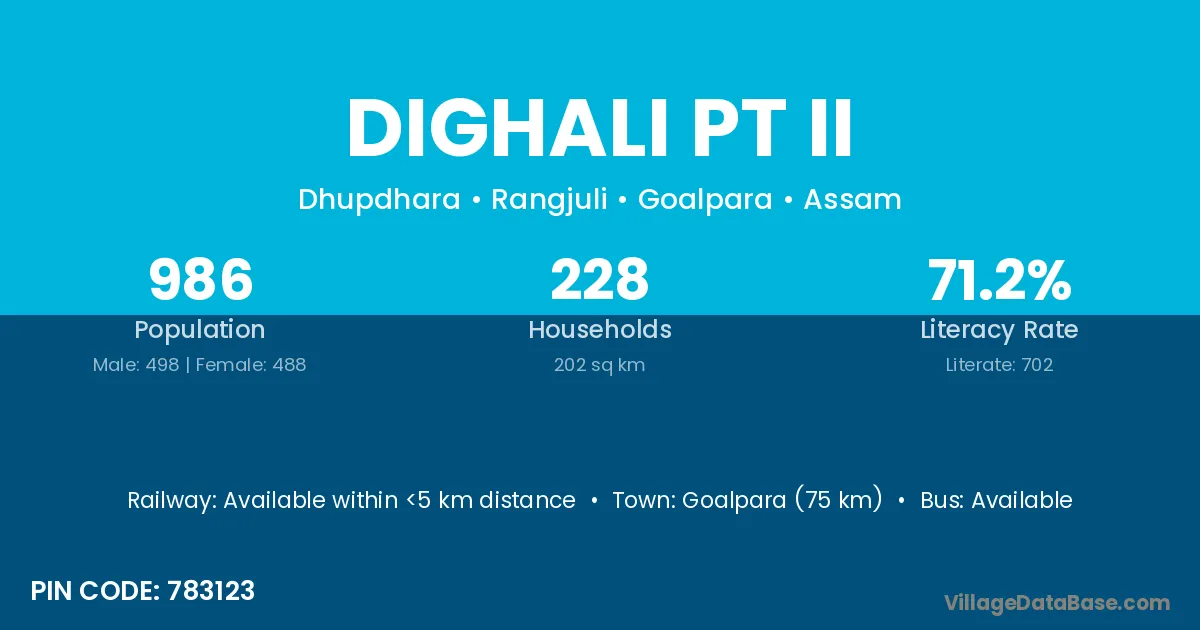 Goalpara (75 km) is the nearest town to Dighali Pt Ii village for major economic activities and is located approximately 75 km away.