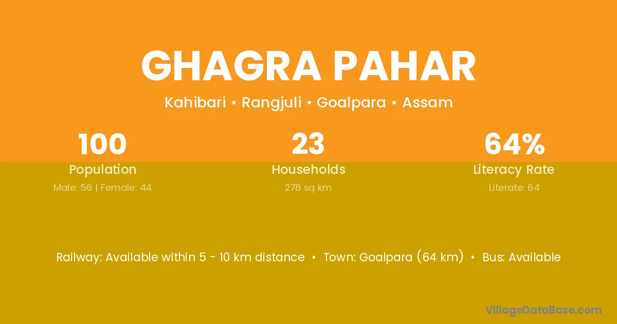 Goalpara (64 km) is the nearest town to Ghagra Pahar village for major economic activities and is located approximately 64 km away.