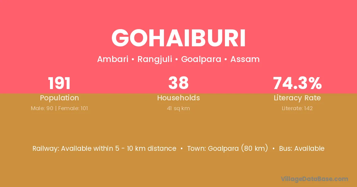 Goalpara (80 km) is the nearest town to Gohaiburi village for major economic activities and is located approximately 80 km away.