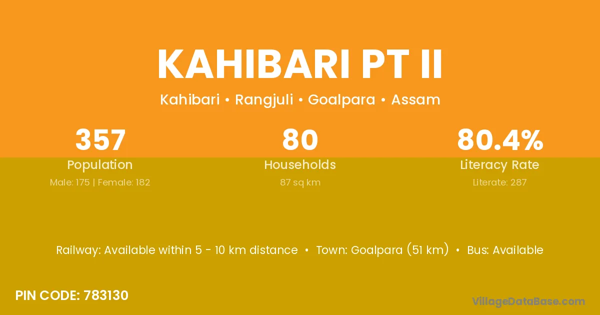 Goalpara (51 km) is the nearest town to Kahibari Pt Ii village for major economic activities and is located approximately 51 km away.