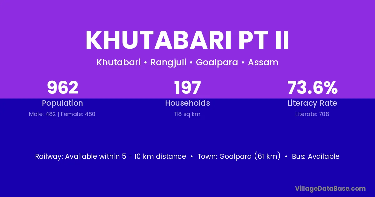 Khutabari Pt Ii village has a total population of 962 people, of which 482 are males and 480 are females.